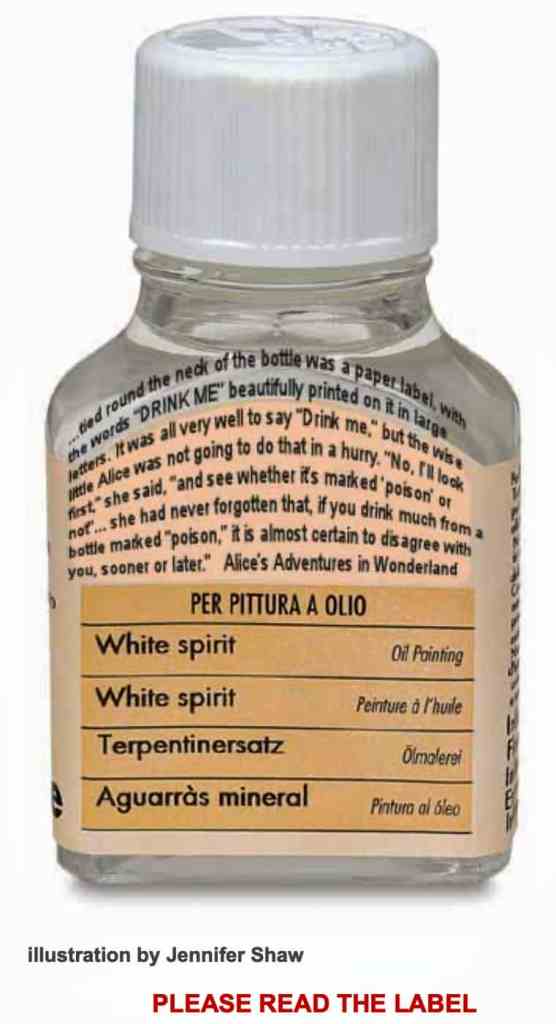 Chronic inhalation of large amounts of solvents could result in decreased coordination, behavioral changes and brain damage…Chronic inhalation of turpentine can cause kidney damage and respiratory irritation and allergies. In the case of mineral spirits, this is usually due to chemical pneumonia caused by aspiration (breathing in) of the mineral spirits into the lungs after vomiting. Natural resins (copal, damar, rosin, Japanese Lacquer) may cause skin irritation or allergies. Rosin dust can cause asthma.