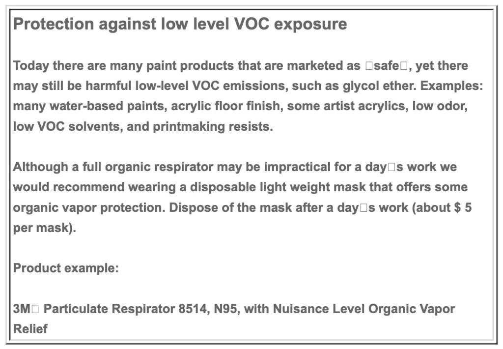 On the UICs Health and Safety in the Arts website, the safety experts Angela Babin, Michael McCann and Devora Neumark write about the much under-rated solvent hazards: