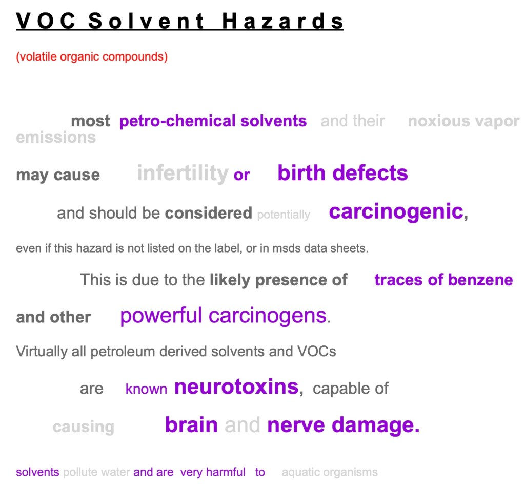 Virtually all petroleum derived solvents and VOCs are known neurotoxins, capable of causing brain and nerve damage. Solvents pollute water, even in very small amounts, and are very harmful to aquatic organisms.