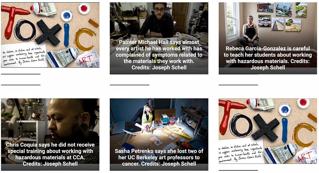 Painter Michael Hall says almost every artist he has worked with has complained of symptoms related to the materials they work with | Rebeca Garcia-Gonzalez is careful to teach her students about working with hazardous materials. | Chris Coquia says he did not receive special training about working with hazardous materials at CCA. | Sasha Petrenko says she lost two of her UC Berkeley art professors to cancer. Credits (images below): Joseph Schell
